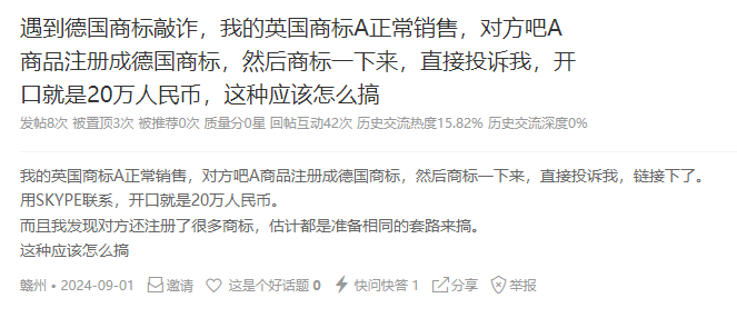 其中一位“受害”卖家在论坛求助:自己的英国商标在德国遭到他人抢注,还被抢注的德国商标投诉侵权,导致自己的店铺链接被迫下架,对方猖獗到“狮子大开口”要求卖家给20万转让费!不仅如此,卖家发现对方还注册了很多别人的商标,看来有同样遭遇的“受害者”不止一个。