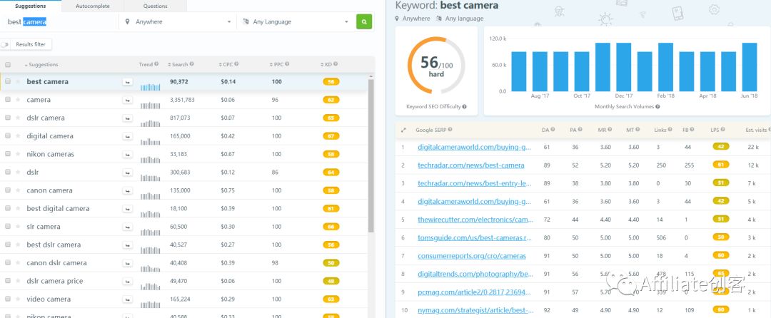 可以看到camera里有一些其他的关键词,并且有具体的搜索量单价,你可以大致看出以camera为主的文章有哪些词可以写。
