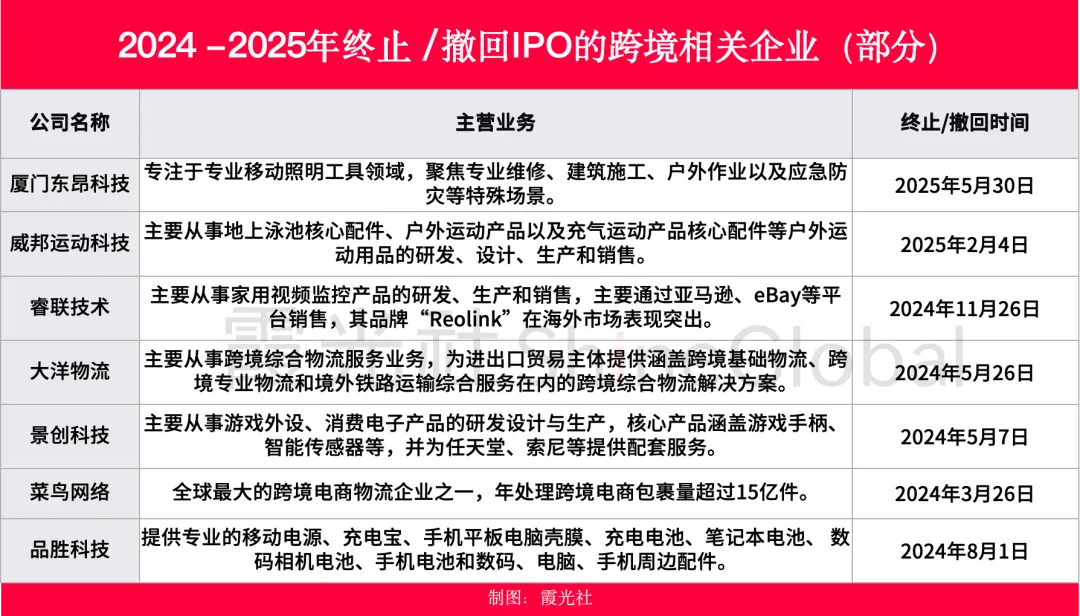 除了已经上市的,部分筹备上市的跨境电商企业也纷纷撤回申请。据不完全统计,包括厦门东昂科技、威邦运动科技、睿联技术、景创科技和品胜科技和在内的多家知名企业,纷纷终止了IPO或收购计划。