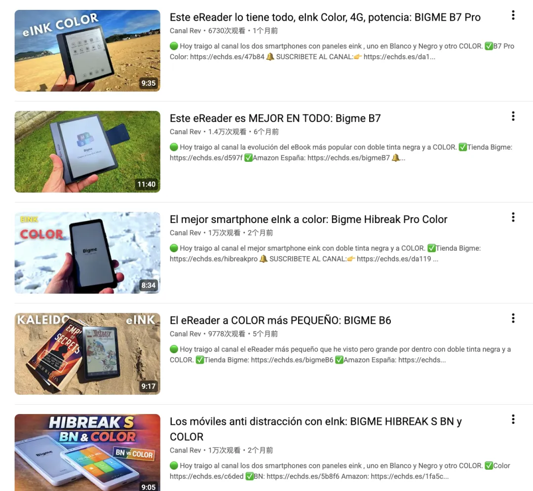Bigme的合作策略非常务实:通过Canal Rev发布多条深度评测视频,标题直接突出产品优势,如“Este eReader es MEJOR EN TODO: Bigme B7”和“El eReader a COLOR más PEQUEÑO: BIGME B6”。