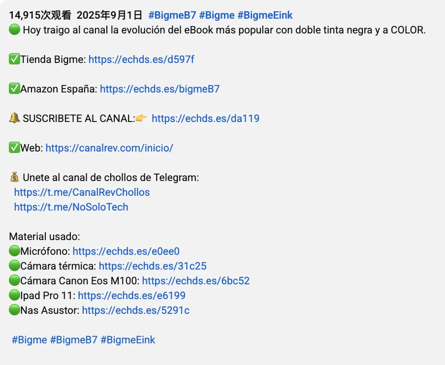 从转化路径看,Canal Rev在视频描述中直接放置了Amazon España和Bigme官方商店的购买链接,并附上Telegram折扣群入口,将内容流量高效导入销售渠道。