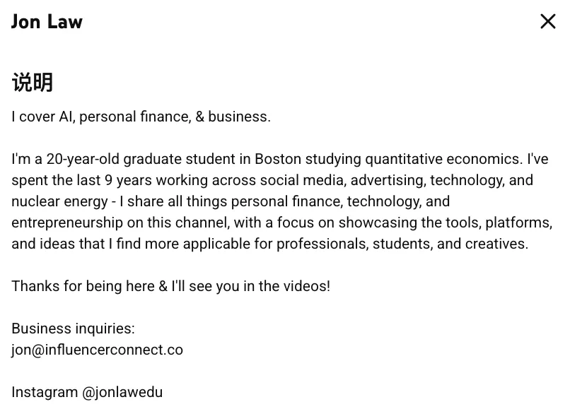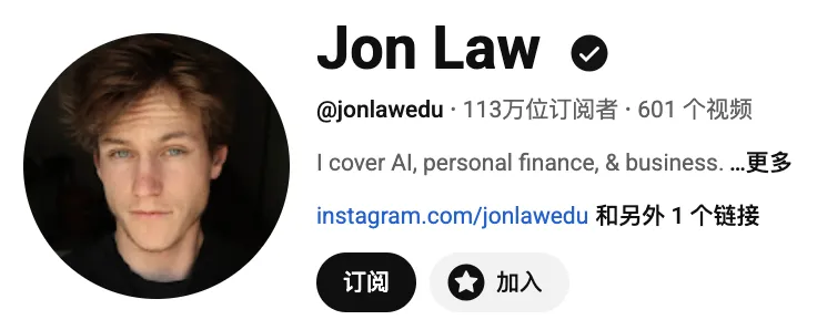 Jon Law是一位在海外社交平台拥有百万级粉丝的年轻内容创作者,自称20岁的量化经济学研究生,专注于AI工具、个人理财与职业发展领域。