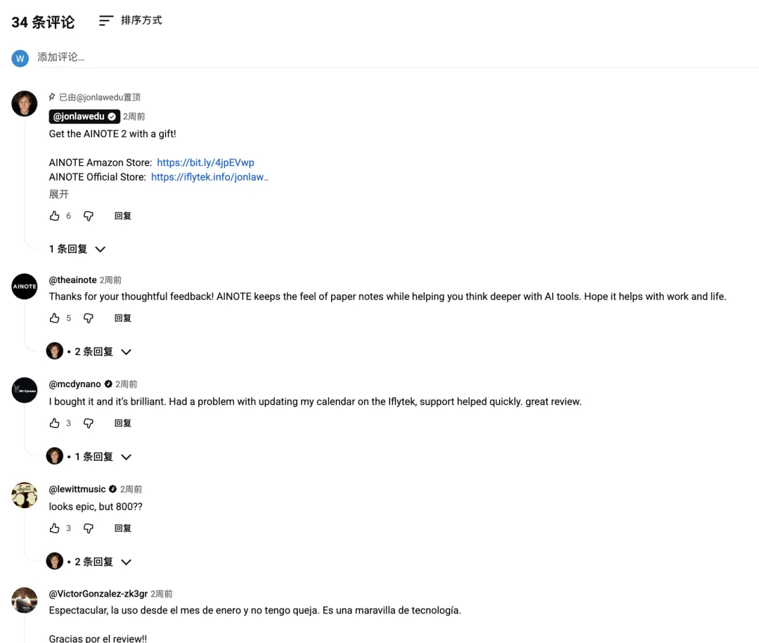 更重要的是Jon在视频描述和置顶评论中直接放置了Amazon及iFLYTEK官方购买链接,将内容流量直接导向销售页面,实现了最短的转化路径。评论区活跃的讨论与用户购买后的正向反馈,进一步形成了口碑传播的二次发酵。
