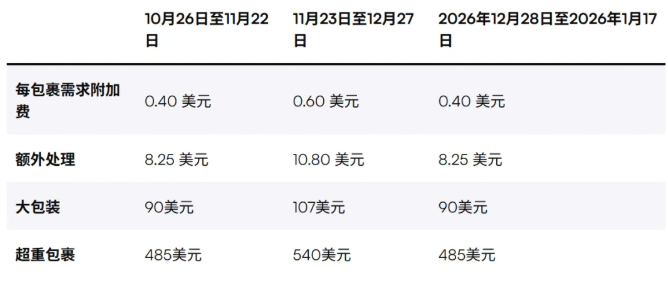 第一阶段:10月26日到11月22日,包裹附加费0.4美元一件。