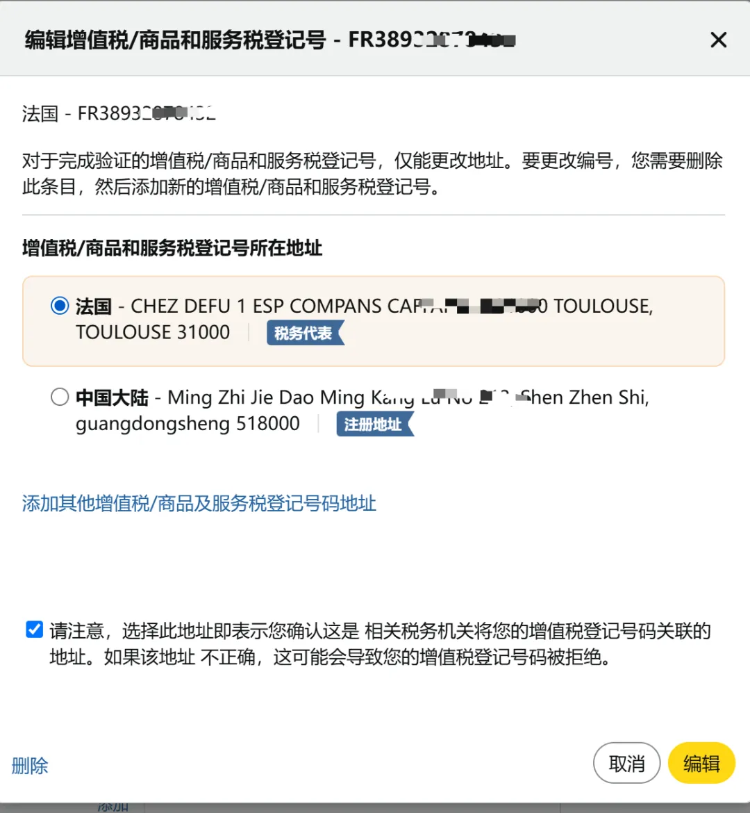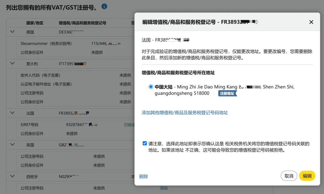 卖家平台填写的公司名称/地址与税务机关数据库中的信息不一致(如公司名称多了一个空格、地址门牌号错误),会触发平台“信息不匹配”异常。例如,法国要求VAT税号的公司名称必须与亚马逊后台完全一致,否则无法通过验证。