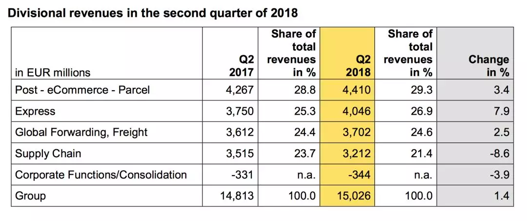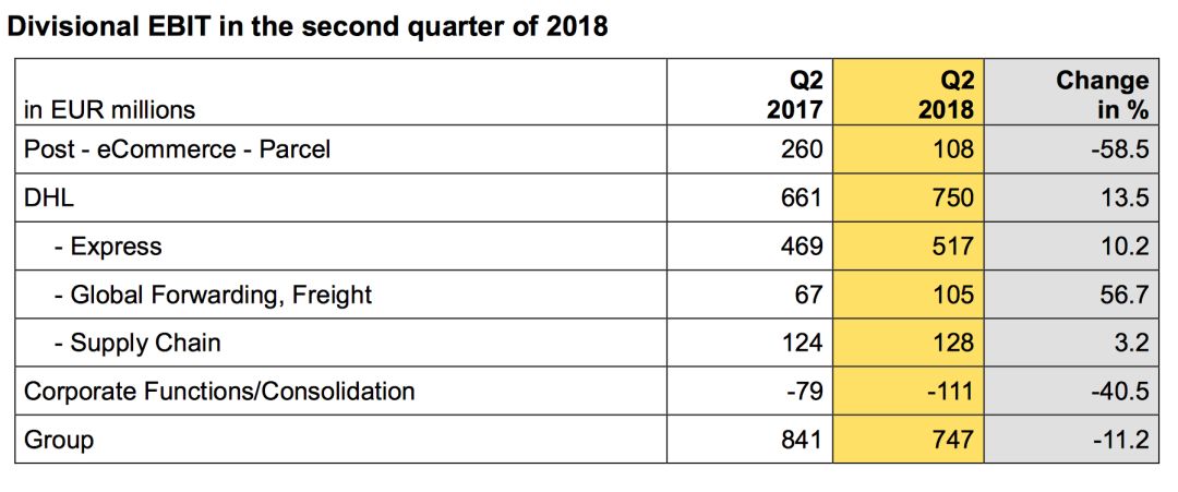 德国邮政敦豪集团2018年第二季度息税前利润(EBIT)报告