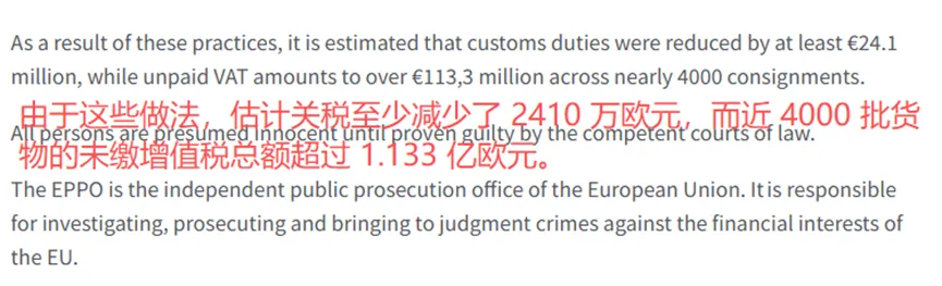 欧盟检察官办公室(EPPO)突然发起代号“Podlimit”的专项调查,结果揪出了一起惊天大案——4000多批中国进口货物涉嫌偷逃税款,给欧盟造成的损失高达1.374亿欧元,约合人民币11亿元。