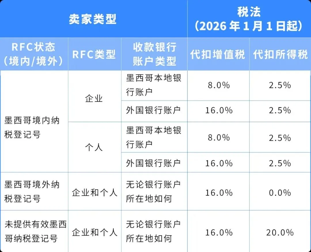 以亚马逊为例,自2026年1月1日起,根据墨西哥税法要求,亚马逊需从卖家销售额中代扣增值税和所得税;