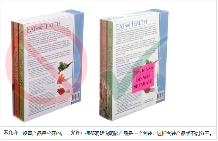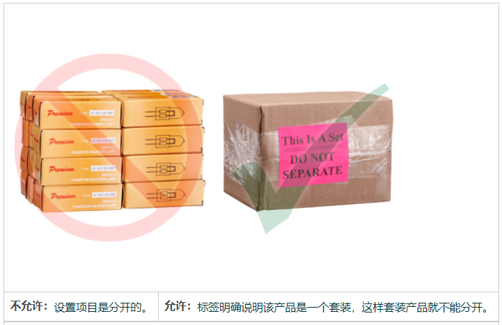 成套出售的物品,例如一套 6 种不同的玩具车,必须在包装盒上清楚地标明为一套。在物品上贴上标签,说明该物品是成套接收和出售的。例如,在产品包装上贴上标签,注明“成套出售”、“准备发货”或“此产品是一套。无需分离”。