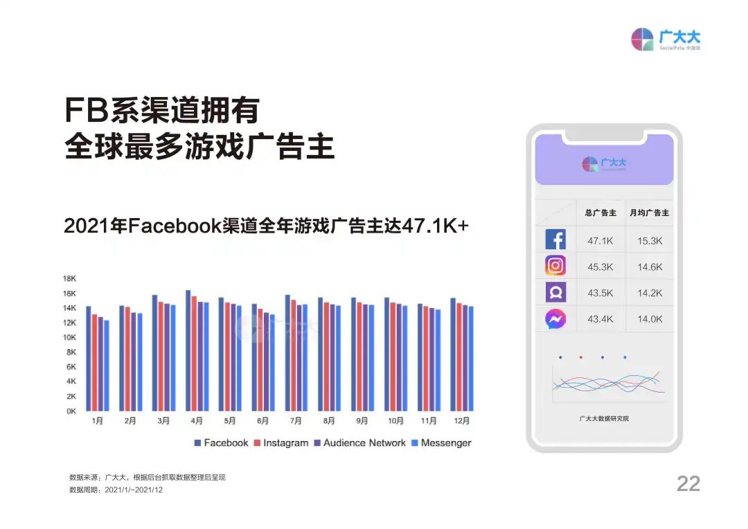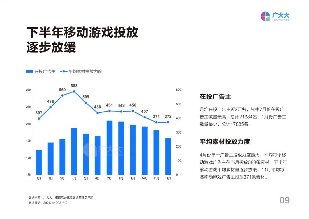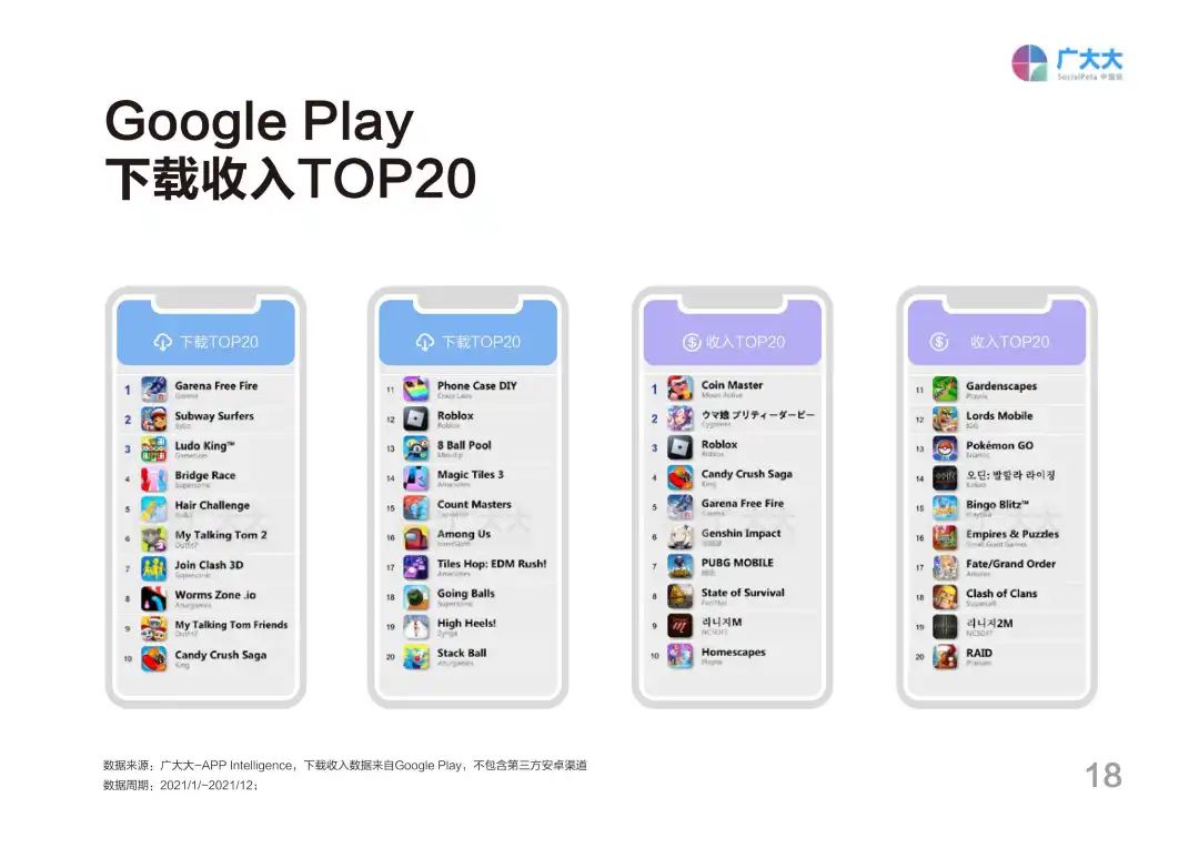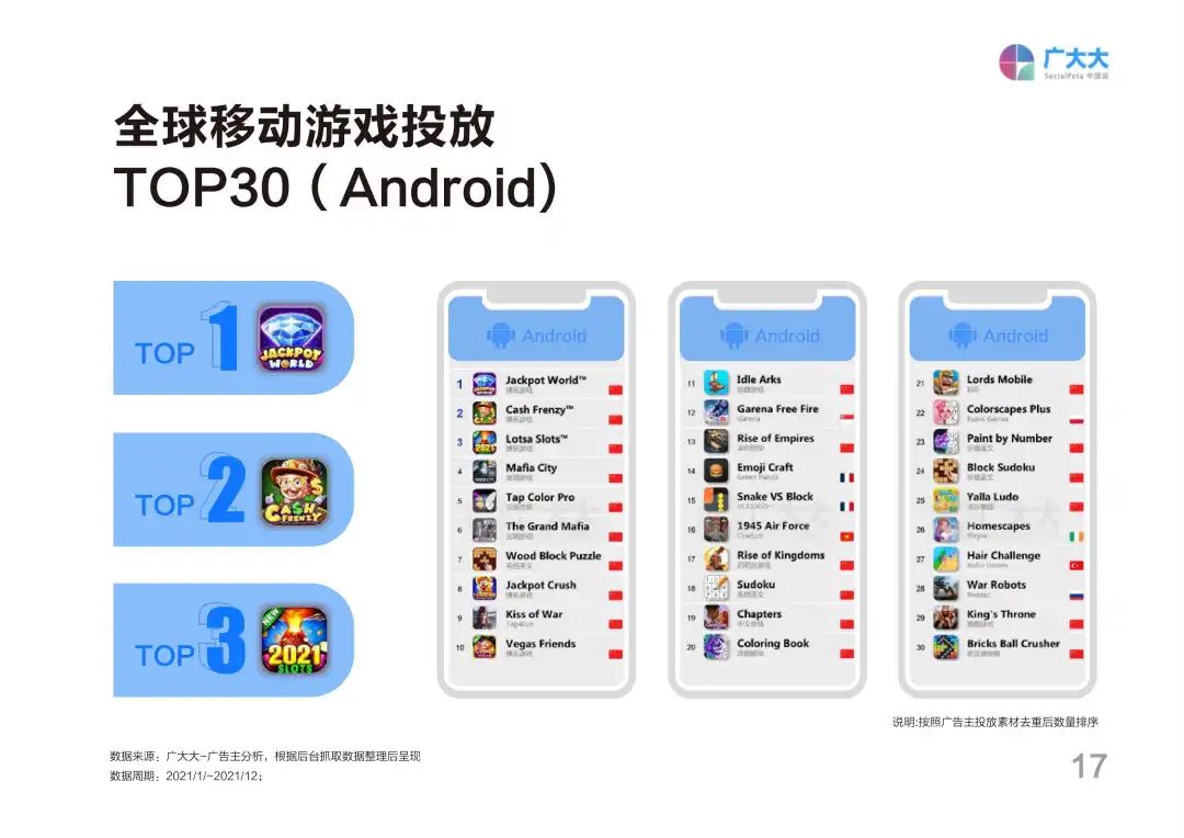 2021年被称为后疫情时代,这一年里游戏行业发生了很多大事情。作为长期服务于手游行业的营销数据分析工具,广大大在年初之际发布《2021全球移动游戏白皮书》,希望为各位带来一些有价值的数据与观点。本次白皮书的数据覆盖了全球70个国家/地区,国内外累计70+移动营销渠道,累计移动营销素材超10亿,及App Store & Google Play两大全球热门商店的下载、收入信息。