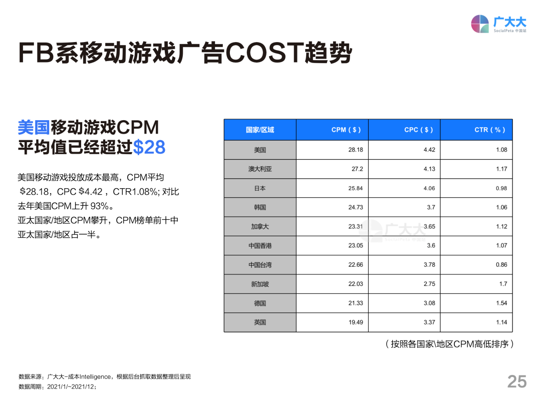 今年FB系投放成本飙升,CPM平均值$20.99,同比增长34%,其中以美国CPM最最高,平均值已经超过$28。