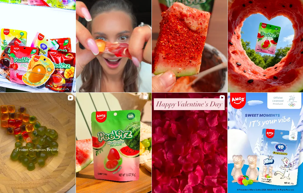 相比之下,来自中国的另一个糖果企业金多多旗下的Amos Foods Group(阿麦斯)的策略更具内容导向特征。在进入欧美市场的过程中,品牌将视觉内容生产与平台运营置于较高优先级。通过持续输出具有强烈视觉冲击力的产品展示视频,品牌将糖果转化为算法环境中易被识别与推荐的内容单元。