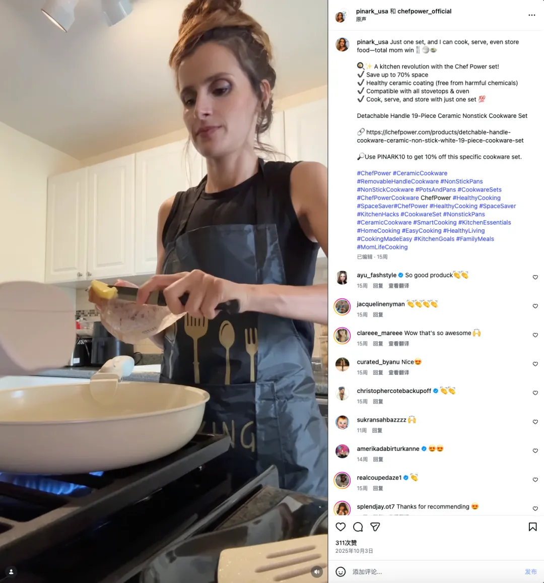 在红人合作上,Chef Power的选择同样延续了这一思路。它并没有把重心放在专业的评测KOL,而是更偏向家庭、美食、LifeStyle类创作者。尽管粉丝数量都不多,但因为她们的内容本身就建立在“可信日常”之上,因此互动率和粉丝信任感都是非常强。