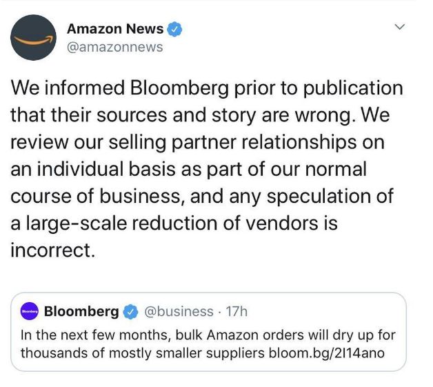 随后亚马逊推特上回应道:“我们在彭博社发布消息前已经告知对方他们的消息和来源都是错误的。作为我们正常业务的一部分,我们会对销售合作伙伴关系进行个别评估,任何有关大规模清洗VC卖家的猜测都是错误的。”