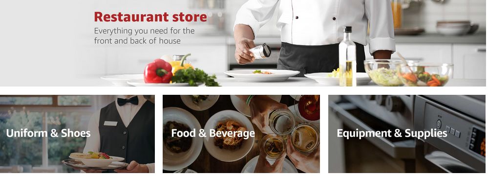 在Amazon 上,餐馆老板可以找到海量选品,从后厨设备、餐饮器皿和餐具,到服务员服装、儿童餐椅,应有尽有,品牌繁多;让他们可以一站式采购,省去了去线下去找不同分类的供应商进行采购的步骤。