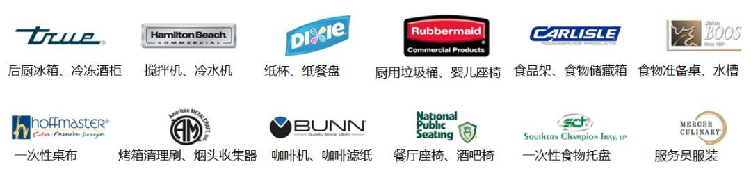 包括一次性用品、酒吧酒具、食品及菜肴传送、抽油烟机、工作台、菜单和检查显示器、食物准备设备、餐厅家具、长手套和蒸汽桌以及漏井。