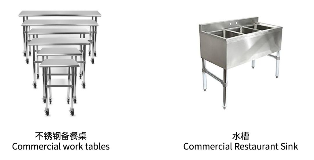 不锈钢设备主要包括不锈钢备餐桌(commercial work table)和水槽(commercial restaurant sink)。