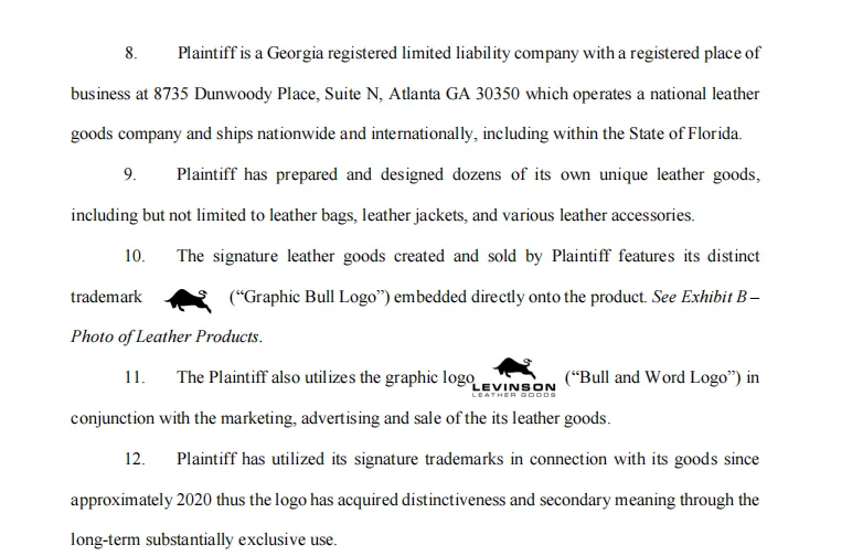原告 Levinson Leather Goods 是一家位于美国佐治亚州的皮革制品公司,专注于手工制作皮革制品的品牌。主要产品包括男士和女士的皮革手袋、公文包、背包及配饰等。例如,Levinson Everest buffalo leather messenger bag(Levinson 珠穆朗玛水牛皮信使包)、Parker leather messenger bag for men(男士帕克皮革信使包)等,产品价格范围较广,不同款式价格有所差异。本次维权公牛图形标识如下,主要印在皮包上,请皮革箱包卖家注意排查避雷!