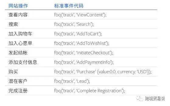 查看网页内容、搜寻、加到购物车、加到心愿清单、发起结帐、添加支付信息、购买、潜在顾客、完成注册。