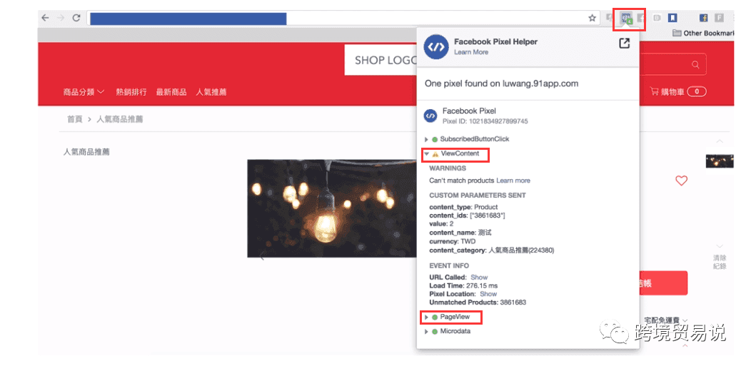 Facebook Pixel Helper地址栏的图标旁边的绿色数字代表当前页面上目前所发送的像素的数目。进入你自己网站,再点开这个工具后你可以看见你的网站有没有发送相应的Pixel ID,对应的事件。你如果在页面安装了基础代码的话,你就会看到Page View,你若安装了其他的标准事件,你会看到ViewContent。检查的安装情况,绿色的标记代表正常,红色代表没有发送成功。
