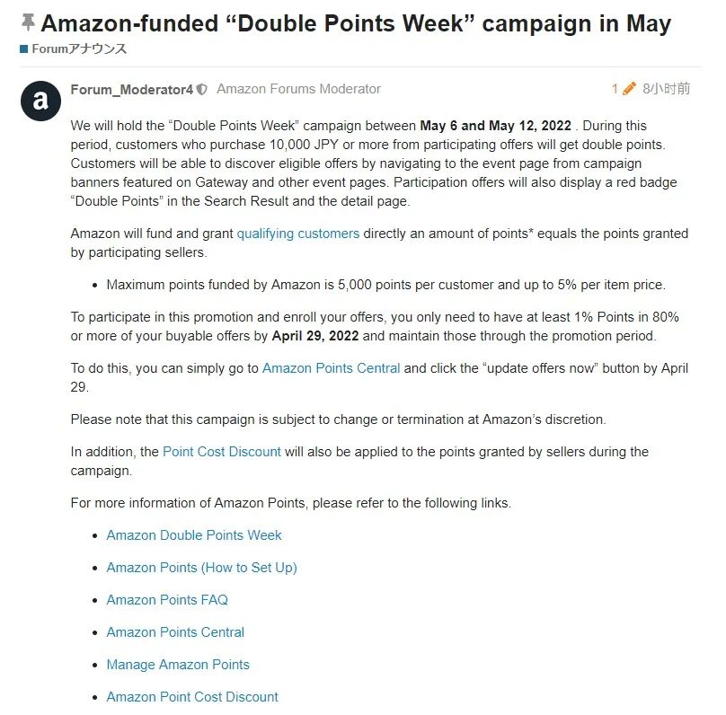 4月11日消息,亚马逊日本站近日发布公告,将于5月6日-12日举办“双倍积分活动”,在此期间通过参与优惠购买10,000日元或以上的买家将获得双倍积分。