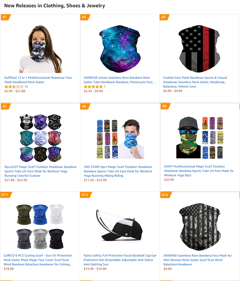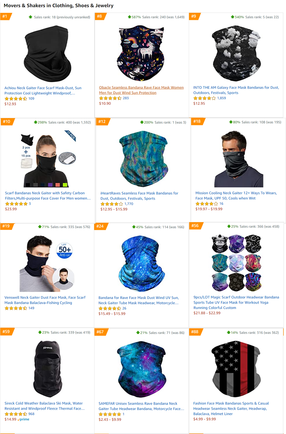 一两周前服装大类Clothing, Shoes & Jewelry榜单上主流还是休闲服饰、休闲拖鞋这样的产品,最近几天,不论Movers & Shakers飙升榜 、New Releases新品榜还是Best Sellers畅销榜,各种设计的Bandana都有刷榜的感觉。