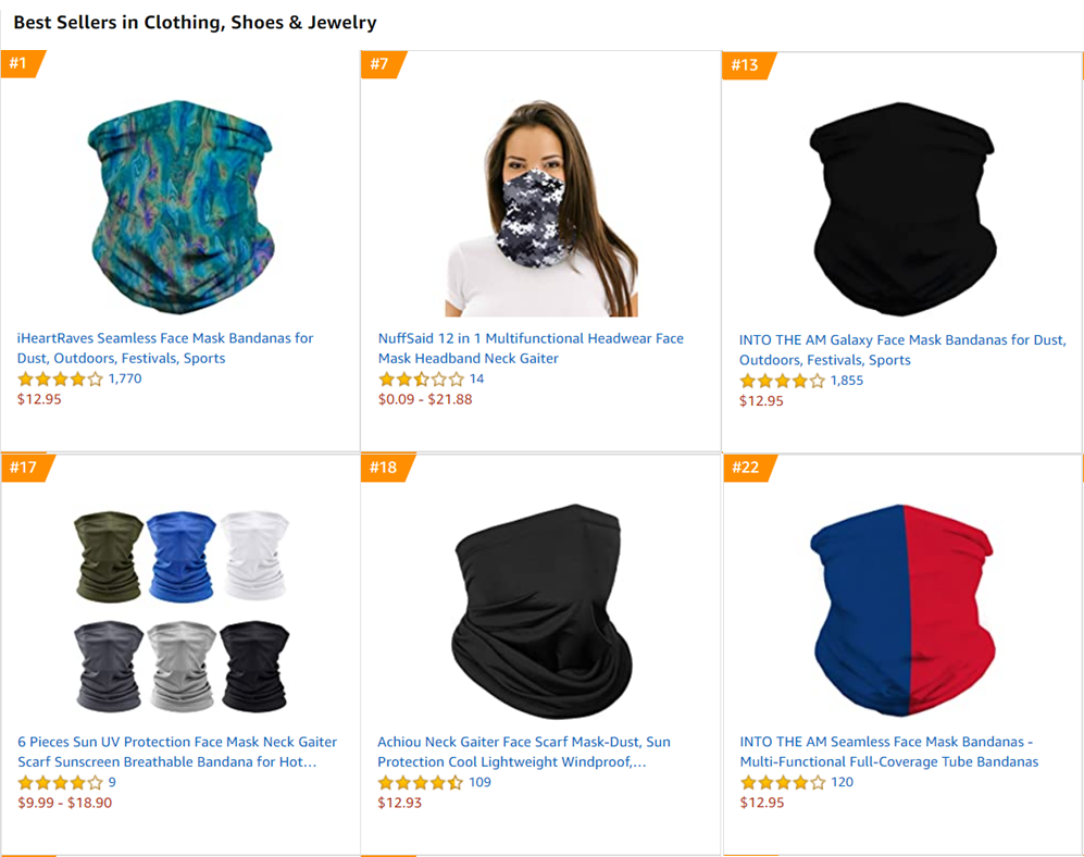 尽管我们都知道戴Bandana围巾对抗新冠病毒真的一点都不靠谱,但这并不妨碍美国人民的疯狂抢购。而且因为这个产品有一定时尚属性和设计溢价,销量并不和价格直接相关。甚至,有时价格高一点,还让买家感觉质量更好。