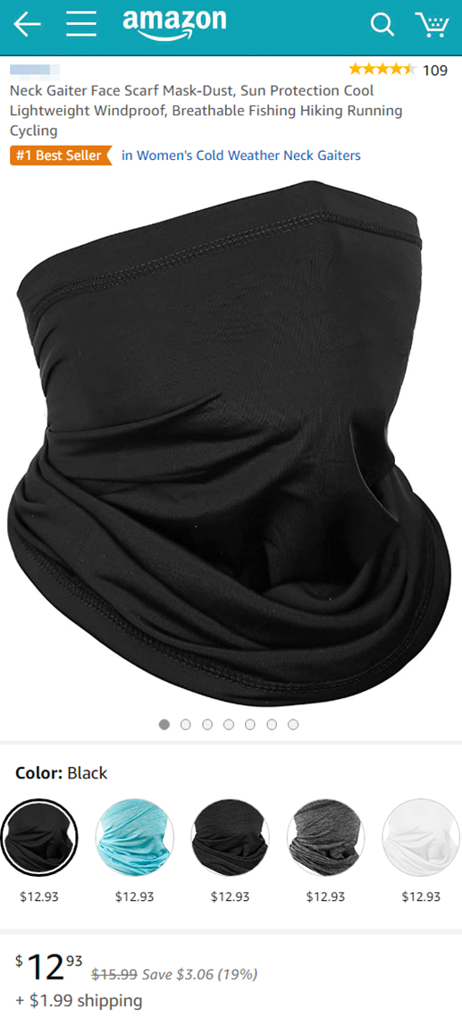 以上这款Women's Cold Weather Neck Gaiters小类销量第一的Bandana围巾,价格不低还要加付邮费,依然很受欢迎。
