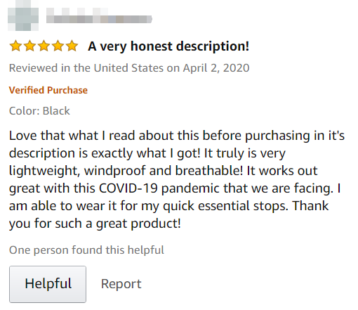 买家二对于这款产品也是一顿猛夸,觉得它轻盈、防风、透气,用于防控病毒实在太棒了!