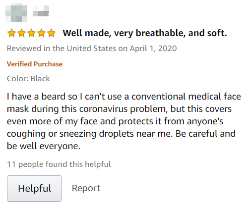 买家三表示因为他有胡子,所以用不了医用口罩,他觉得这款围脖能更大面积覆盖他的面部,能有效阻挡飞沫。可见这位哥们明显对医用口罩有误解。