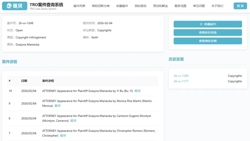 从赛贝TRO案件查询系统获悉, 原告波兰知名插画艺术家Grazyna Maniecka在2月3日和4日委托代理律所Keith发起版权TRO维权,涉及厨房刀具信息图版权,2025年11月28日拿到版权,应是首次立案。相关类目的跨境电商卖家尽快排查商品!