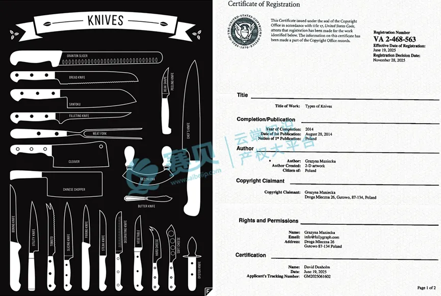 版权注册号:VA 2-468-563;涉案作品名称:《Types of Knives》(刀具类型);作品类型:2D插画(信息图表风格);赛贝提醒跨境卖家,未经授权不得擅自使用,以免引发侵权风险。