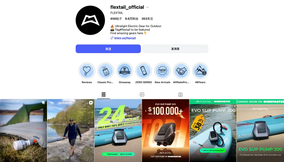因此,为了让基数最大的户外新手乃至于户外体验者下单购买产品,Flextail还在Instagram和TikTok上合作了不少Lifestyle红人,并将产品嵌入到用户喜爱的视觉叙事中。
