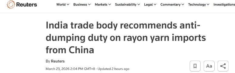 路透社最新报道称:印度贸易部下属的贸易救济总局周一发布政府通知称,该局建议对从中国进口的粘胶人造丝长丝纱线(Viscose Rayon Filament Yarn,简称VFY)征收每公吨386美元至1071美元的反倾销税。