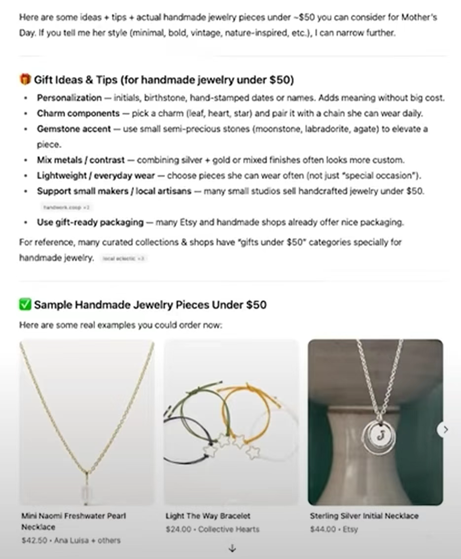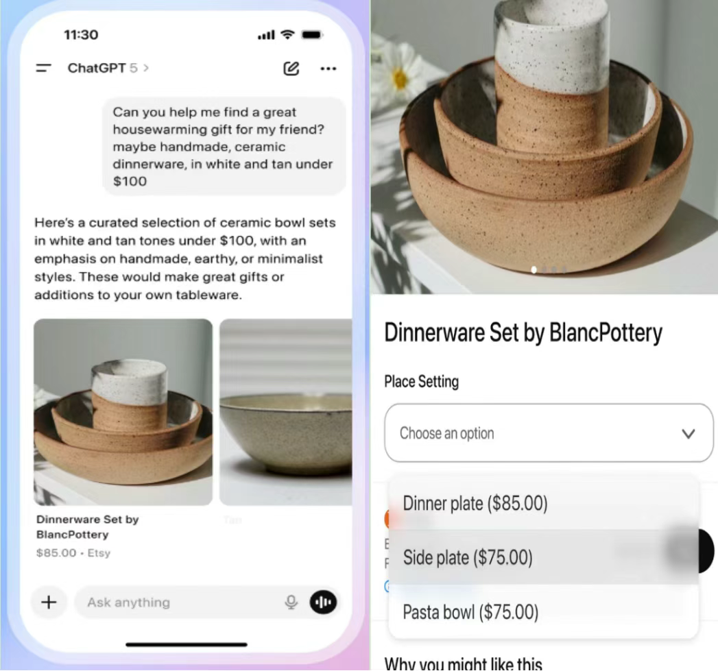 从OpenAI的演示中能看到,是真的很方便:用户输入“给乔迁朋友选个白棕配色的手工陶瓷餐具,预算100美元内”,它就能直接抓取商品、给出预览图和推荐理由,甚至一键完成支付。