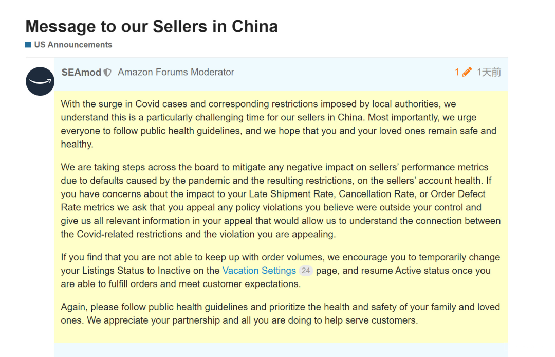 除此之外,亚马逊美国站也发布了公告表示,随着中国疫情严重蔓延波及中国多个省份,亚马逊正在全面采取措施降低中国卖家受疫情影响对账户健康状态造成的影响。