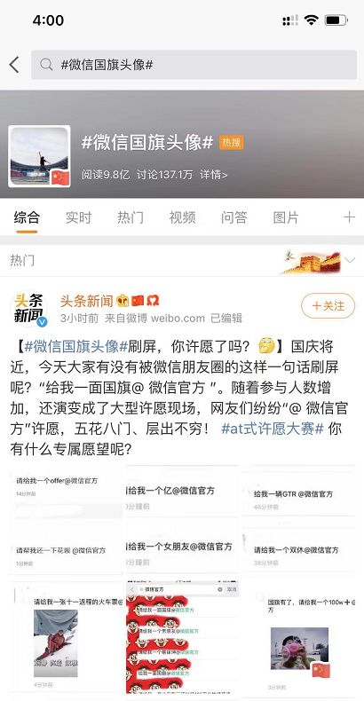 更有人立马打开微信公众号,推文追热点:“教程|给我一面国旗@微信官方”。一上午涨粉12万、10万+阅读的文章N篇,同时微博热搜更是居高不下,截止到下午4:00,9.8亿的阅读。