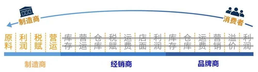 按照传统渠道来说,一件产品从制造商到到达消费者手里,需要经过品牌商、经销商等的层层溢价,因为中间环节太多,商品到用户手中的时候,价格已经翻了数倍。