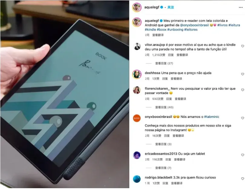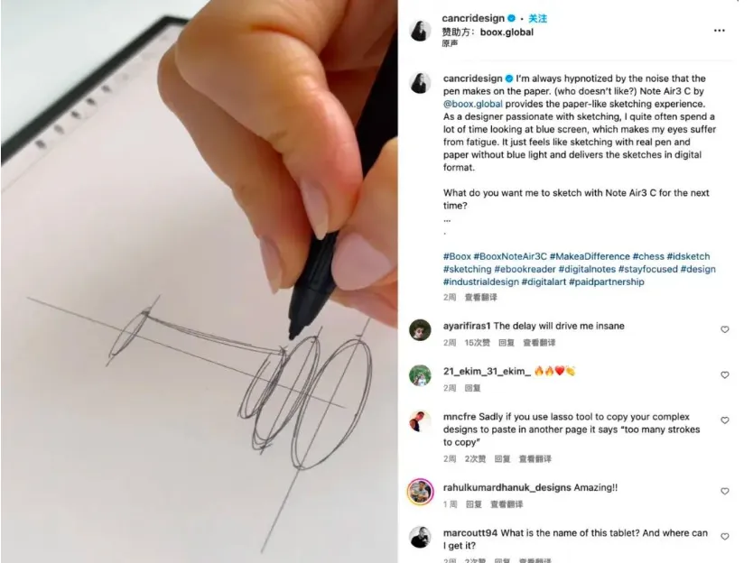 该品牌在海外市场份额的持续增长,得益于将产品应用场景从单纯的“读”扩展到了“写、画、改、传输”等多应用场景。同时,结合了海外红人营销助力,成功破圈,成为海外热门的电子纸品牌。