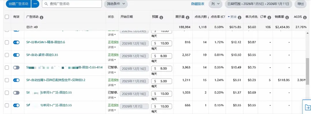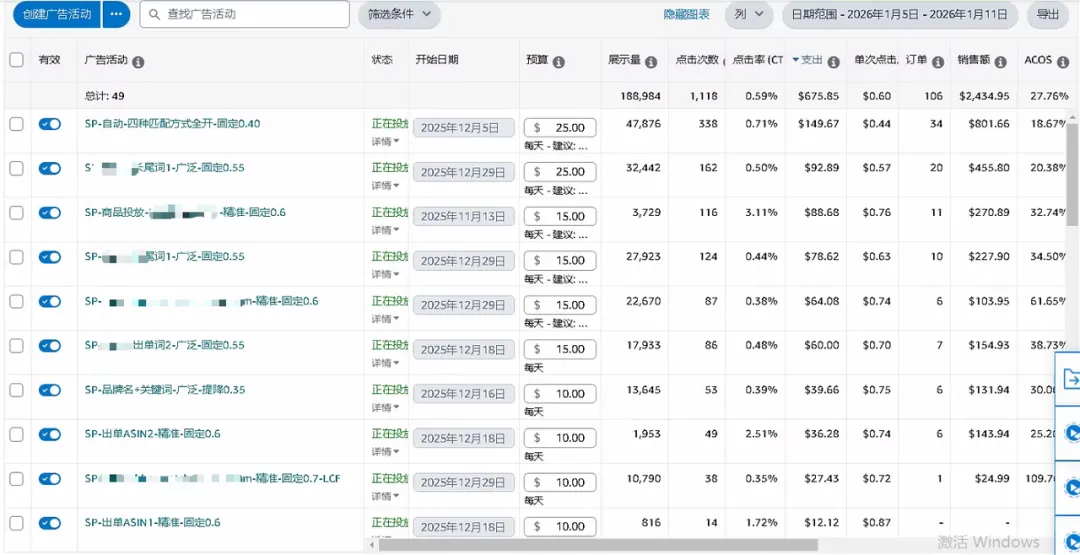 1月份补货到仓后,我开始持续做增量优化。有了前一个多月的数据积累,接下来的操作就清晰多了。我从搜索词报告中,把表现好的词筛选出来进行再投放。比如截图里的品牌词、商品投放,都是从搜索词报告里挖掘出来放大的。相关广告活动的表现如(图3和图4)所示。