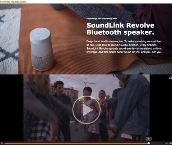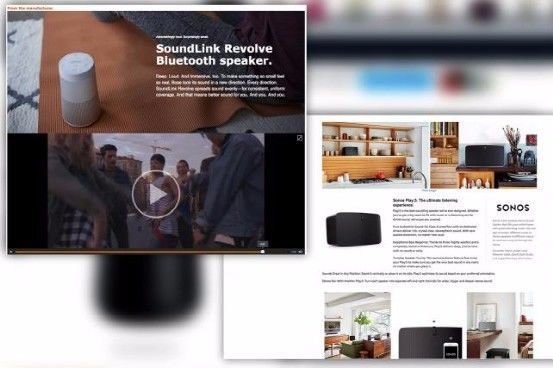比如,下图Bose Revolve扬声器的产品页面充满了新的元素,包括视频和交互式对比指南,可以浏览其他Bose产品功能。而它的竞争对手Sonos扬声器产品页面的动态性和吸引力就差了一点。