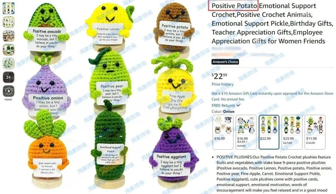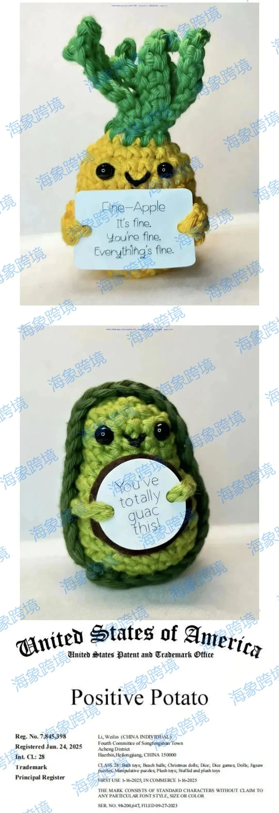 本案为国人原告,售卖以 POSITIVE POTATO 商标命名的毛绒玩具和钩编玩偶产品,其中包括一款通常手持印有 POSITIVE POTATO 字样卡片的毛绒土豆玩偶。类似款式玩偶曾发案专利,本案涉及商标注册在第28类:洗澡玩具;沙滩球;圣诞娃娃;骰子;骰子游戏;玩偶;拼图;毛绒玩具;填充毛绒玩具。