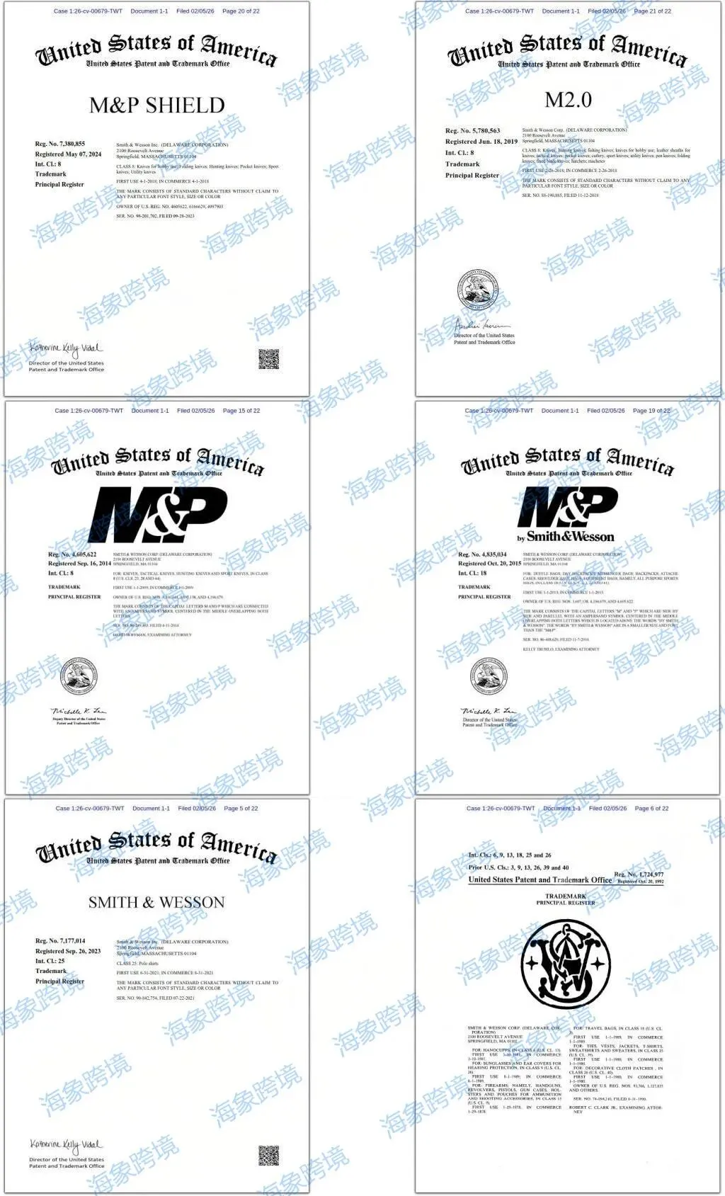 原告 Smith & Wesson Brands, Inc. 于1852年在美国成立,如今是历史最悠久、最知名的枪械制造商之一。原告还提供各种其他消费品,包括T恤、运动衫、帽子、包袋、桌垫、腰带、墙饰、钱包、刀具等等,这些产品均使用或与各种商标相关联。以下商标注册在多个类目,请相关卖家注意排查避雷!