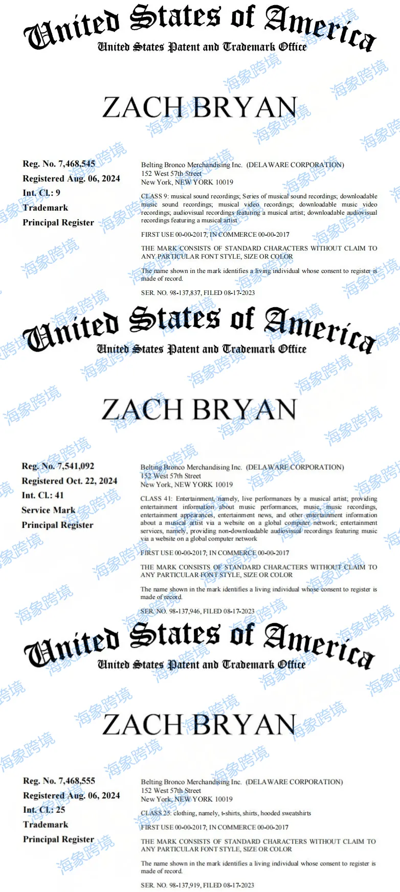 原告 Ceremony of Roses Acquisition LLC 从事各类明星周边商品的生产和销售,包括但不限于巡演手册、T恤、球衣、运动衫、帽子、徽章和海报。ZACH BRYAN 扎克·布莱恩是一名美国乡村乐男歌手、词曲作者。他曾发布过多张广受好评的音乐专辑,具有一定的知名度。以下商标未经允许不得使用!