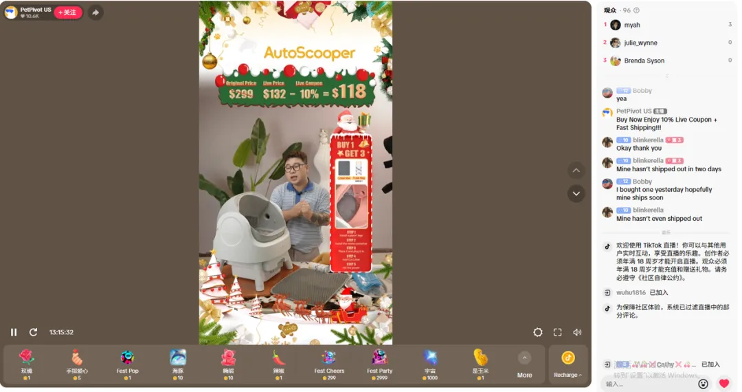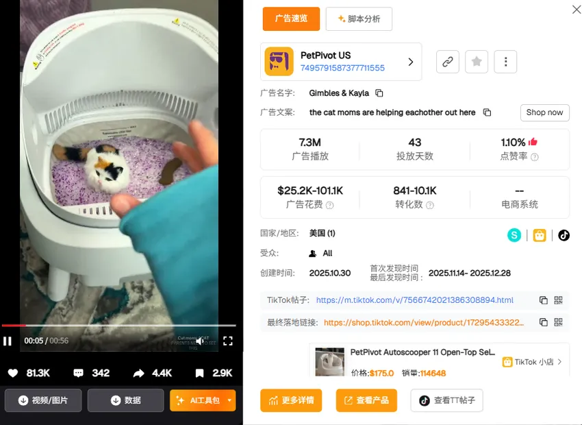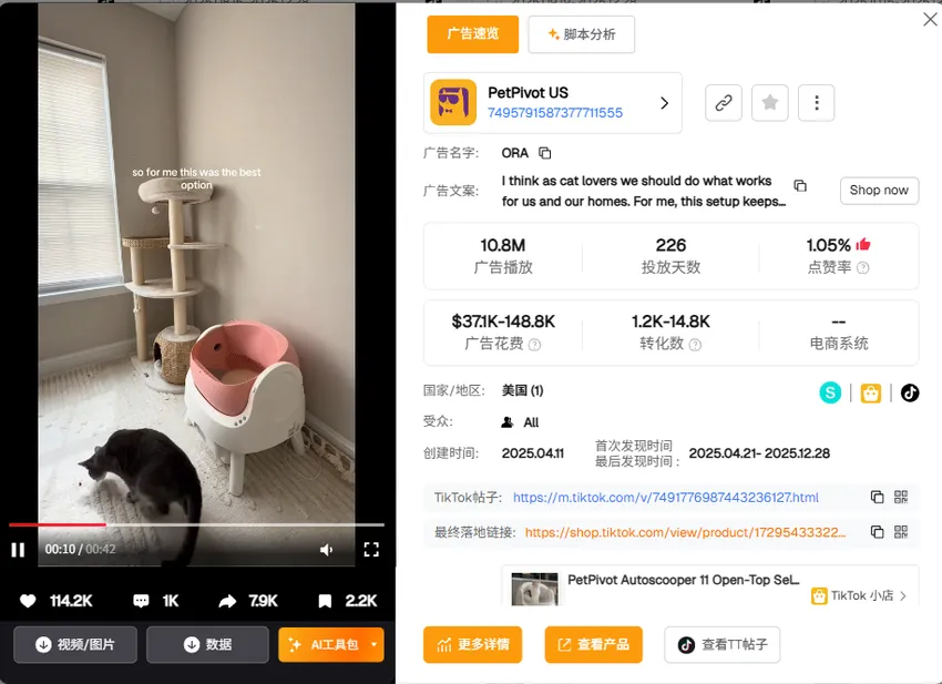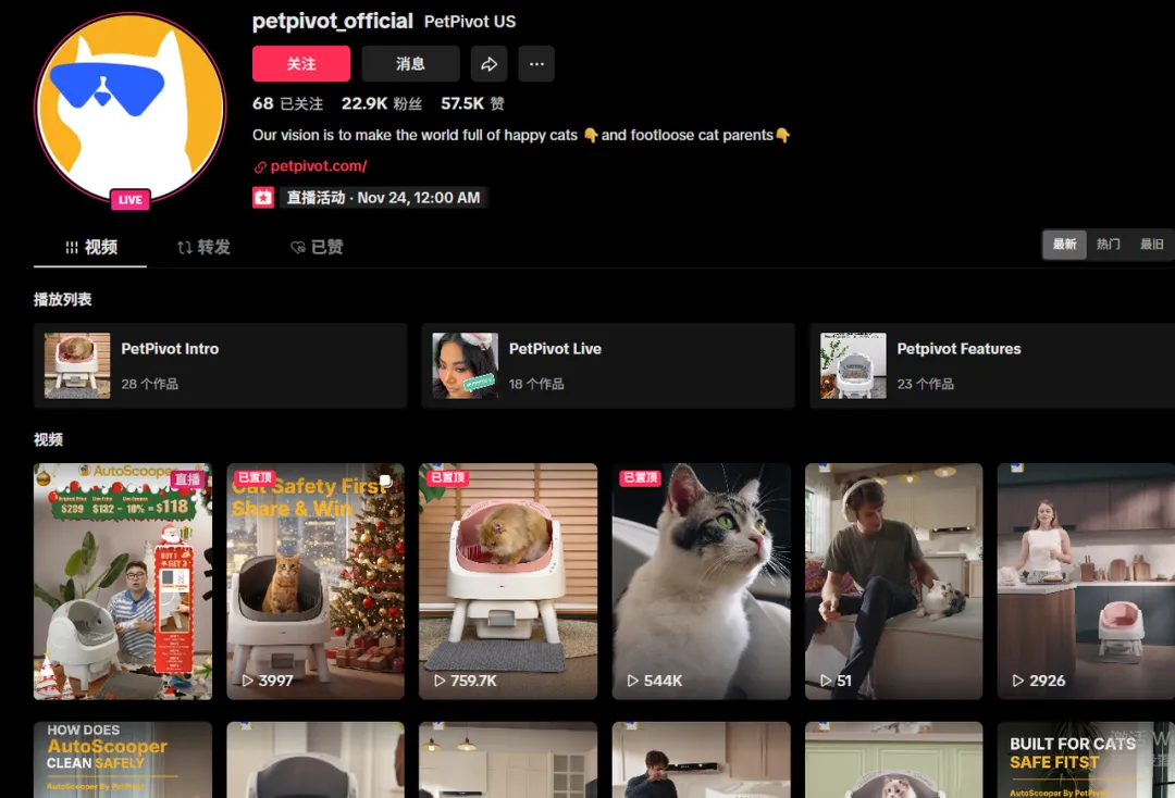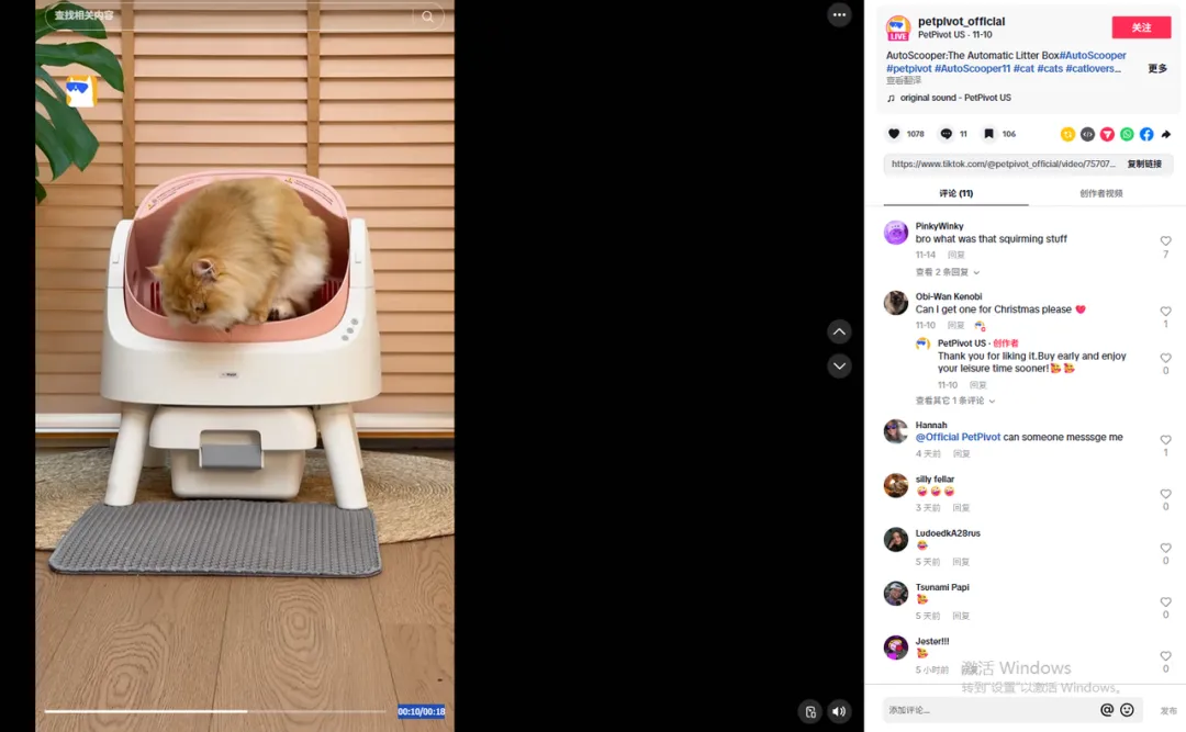 3.通过价格对比和节日使用场景推动购买行动:与市面上高价自动猫砂盆对比使用体验上有明显差异,同时设备内置传感器,猫咪进入时会自动暂停运转,降低安全隐患。带入节日圣诞礼物语境中,并提及此前节日期间曾出现断货情况,引导用户通过下方链接完成购买。
