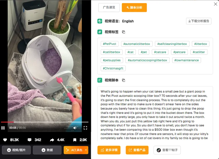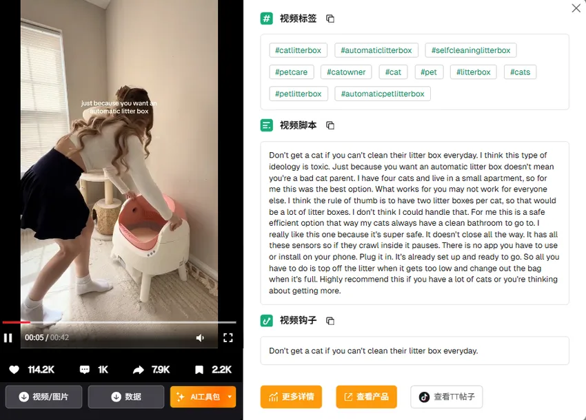 开头视频钩子:Don’t get a cat if you can’t clean their litter box everyday 一秒建立代入感。