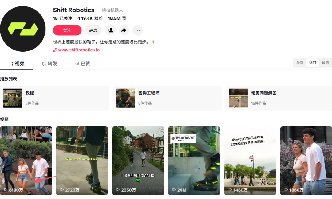 在 TikTok 上,Shift Robotics 的官方账号,活成了一个“产品演示引擎”,而非单纯的卖货账号。目前账号拥有约45万粉丝,总点赞超1800万,所有内容都围绕 Moonwalkers 展开,核心目标只有一个:让用户在最短时间内,看懂这双鞋“快在哪里”。