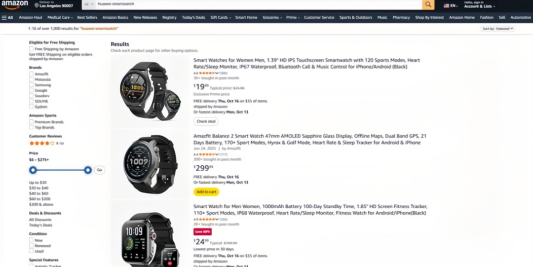 目前在亚马逊前台,如果把地址定位到美国,搜索‘华为智能手表’等相关产品关键词,已经看不到华为的智能手表产品,搜索结果显示的都是其他品牌的手表。