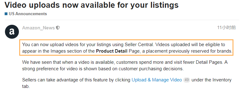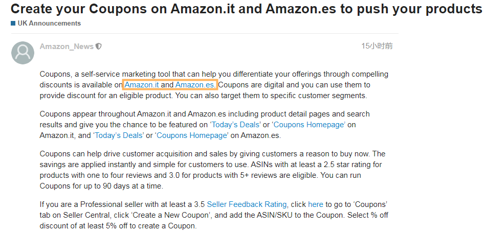 一 意大利和西班牙站:可创建优惠券 8月18日,亚马逊在卖家论坛发布消息称,意大利和西班牙站的卖家可以通过创建优惠券来推销商品。 图源/亚马逊卖家论坛 亚马逊表示, Coupons是一款自助营销工具,卖家可以为符合要求的商品提供有吸引力的折扣(至少5%),也可以面向特定的买家群体推送优惠券(推送优惠券一次最长持续 90 天),让自己的商品脱颖而出。 据悉,卖家所设置优惠券折扣的商品将会展示在商品详情页面、搜索结果页面、秒杀以及优惠券页面。另外,卖家还可以将此功能与亚马逊 Sponsored Products相结合,从而提高商品的点击率和转化率,带动销量的同时也能提升卖家品牌和商品在亚马逊上的知名度。 ASIN要求: 有一至四条评论; 星级评定至少为 2.5;或 有 5 条以上评论的商品; 星级评定为 3.0。 创建优惠券页面: https://sellercentral-europe.amazon.com/sellercoupons/coupon(复制到安全浏览器环境下打开) 二 亚马逊正式官宣:开放视频上传功能 前段时间,很多卖家收到亚马逊的邮件通知,将允许非品牌卖家上传视频至Listing图片部分。8月19日,亚马逊正式官宣了这一消息。 图源/亚马逊卖家论坛 亚马逊表示,消费者更喜欢通过短视频方式了解商品和服务,并作出购买决定。这也就意味着,非品牌卖家通过视频流量入口,也可以更精准的推销商品。但需要注意的是,品牌卖家优先级高于非品牌卖家,并且需要注意上传的视频格式以及是否符合视频上传政策要求。 视频上传页面: https://sellercentral.amazon.com/creatorhub/video/library(复制到安全浏览器环境下打开) 三 账号关联、二审再来袭:大批卖家被封号 对于亚马逊账号关联和二审问题,可能很多卖家已经司空见惯了。每年的旺季前后,亚马逊基本上都会进行一波大清扫。