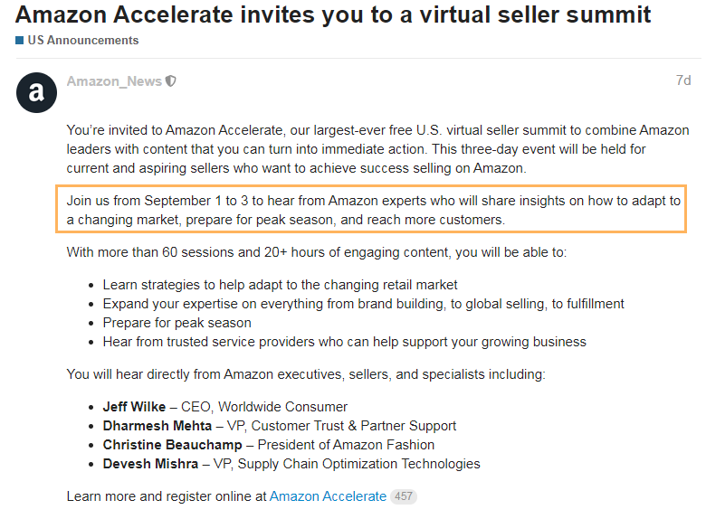继“7.31关联事件”后,8月14日,船长又收到很多卖家反馈,账号惨遭二审。关于这次大批卖家账号触发二审,有圈内人士猜测,可能与通过服务商购买的链接有关。 在各大卖家群和社区,船长发现,不少卖家表示自己被二审的都是买的链接注册的店铺,更有卖家称是招商经理给的。看到这里肯定大家会有疑惑,招商链接还用买吗?这种情况大概率是不良服务商钻空子,所谓的内部链接都是假的! 船长建议,如果是真实资料注册的可以去申诉,如果是服务商购买的挂了的话,基本无力回天。 四 亚马逊7月发货量:超4月至6月的平均水平 据CNBC引用分析公司ShipMatrix的数据显示,亚马逊在7月份发送了4.15亿个包裹,比4月至6月发货的每月平均3.89亿个增长了6.7%。不过,在7月份的发货量中,亚马逊处理了66%的自有包裹发货量,而前三个月的发货量为61%。 图源/CNBC 相较于亚马逊,UPS的发货量在7月增长了26%,而4月至6月的增长为23%,而FedEx的销量在7月增长了22%,在4月至6月增长了19%。 由此可见,今年下半年,由疫情引发的电子商务热潮似乎没有放缓,消费者需求依旧高涨。卖家可以抓住机会,特别是接下来销售旺季,争取创造更好地销量。 五 9月1日至3日:亚马逊将举行虚拟卖家峰会 近日,亚马逊宣布将于9月1日至3日举行虚拟卖家峰会Amazon Accelerate,届时亚马逊专家会就如何适应不断变化的市场等进行分享。 图源/亚马逊卖家论坛 有兴趣的卖家可以访问以下链接了解会议详情: https://register.amazonaccelerate.com/?utm_campaign=Accelerate-2020-DemandGen&utm_medium=Brand-Owned&utm_source=SC-Forums&utm_content=Announce(复制到电脑浏览器打开) 行业 热点动态 六 美国:已批准向七个州提供失业补助金 据外媒报道,当地时间8月18日,联邦紧急事务管理局(Federal Emergency Management Agency)表示,联邦政府已批准向七个州(亚利桑那州,科罗拉多州,爱荷华州,路易斯安那州,密苏里州,新墨西哥州和犹他州)拨款,以提供300美元的失业补助金。 图源/CNBC 这项补助是美国总统特朗普最近签署的一项行政措施的一部分。在此之前,国会在冠状病毒衰退初期颁布的每周600美元的联邦补贴已经结束。从4月初到7月底,它已经实施了大约四个月。 对于跨境卖家而言,这或许也是一个好消息,临近Prime Day旺季,激发消费者的购物热情,只要大家做好准备,分一杯羹不是问题! 七 亚马逊被要求对第三方销售的缺陷产品负责 产品安全问题一直以来都是备受消费者关注的,船长获悉,上周,美国加州第四地方上诉法院(California Fourth District Court of Appeals)裁定,亚马逊需要为第三方卖家销售的缺陷产品担责。 据了解,法院作出这项裁决的起因是因消费者从第三方卖家处购买了一个有质量问题的笔电电池着火导致其受伤。 业内人士表示,亚马逊接下去很大可能会进一步加强第三方卖家产品质量监管,卖家们千万不要销售存在质量问题的产品,以避免招来不必要的麻烦。 八 外媒:微软正在考虑收购TikTok英国业务 8月17日消息,据外媒报道,微软公司在考虑收购TikTok的英国业务,并且计划将业务扩展到已经在讨论中的美国、加拿大、澳大利亚和新西兰。 图源/网络 知情人士透露,目前尚不清楚TikTok的中国母公司字节跳动是否愿意出售英国子公司,以及是否会有针对该业务的正式要约发出。 与此同时,船长还获悉,从今年9月起,欧洲将有成千上万的用户有资格申请TikTok“创作者基金”,条件是他们年满18岁,关注者基本达到1万,在过去30天内视频浏览量超过1万,并且发布原创内容符合该基金的社区指导原则。 第一年的初始资金为7,000万美元,预计三年内将增加至至少3000万美元。所有符合资格的创作者将能够在TikTok内申请“创作者基金”,并将根据其内容的表现在每月定期分期收到资金。 九 武汉:新开至美国达拉斯定期货运航线 据《湖北日报》消息,8月16日,一架满载110吨出口商品的全货机航班,从武汉天河机场起飞前往美国达拉斯,标志着武汉—达拉斯—洛杉矶定期货运航线正式开通。据悉,该航线出口的货物以电子产品、机械零配件、跨境电商货物为主,货物流向覆盖美国各大城市。 十 商务部:将推动扩大生活必需品等出口 据《商务部》消息,8月13日,中国商务部部长助理任鸿斌表示,1-7月中国进出口好于预期。据官方数据,7月中国出口额同比大增10.4%,增速创17个月新高。 下一步中国将继续巩固传统市场,开拓新兴市场,深化“一带一路”经贸合作。在符合疫情防控要求下,有序恢复各类经贸活动正常开展。积极推动扩大生活必需品等出口,继续做好防疫物资出口工作,严控出口质量,规范出口秩序。 此外,针对疫情之下外贸企业争取订单困难,中国还将支持和鼓励地方政府、重点行业协会举办更多的线上展会,帮助企业开拓海外市场。